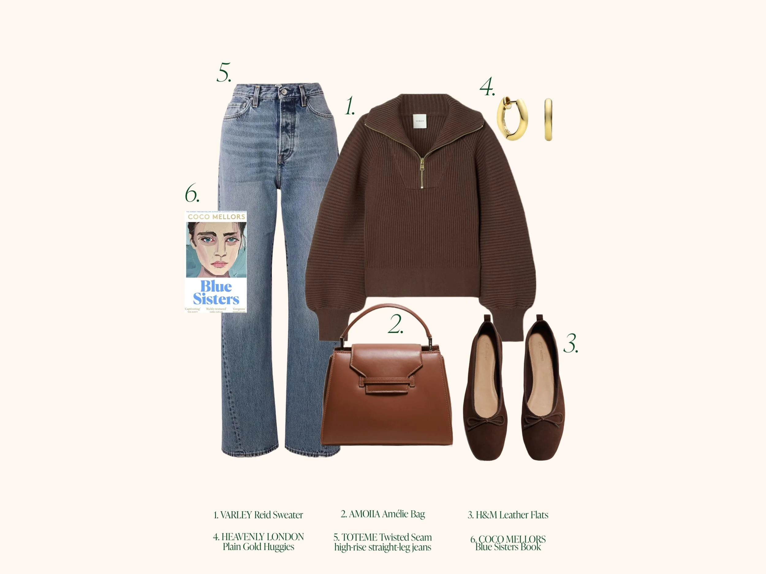 If you manage to ever go out by yourself for a coffee as a mum, congrats! Why not bring Coco Mellor’s Blue Sister book with you and catch up on some reading? The Varley Reid sweater is perfect to just throw on and look chic as are the Toteme straight-leg jeans that have this cool twisted seam. Brown is the colour of the moment and you really can’t go wrong with these brown suede leather flats from H&M. Finishing off this chic and easy-to-throw-on look, are some fabulous accessories. The Amoiia Amélie bag is a classic and modern piece that is incredibly well-handcrafted and everyone should have a pair of gold huggies in their jewellery box. Our pick is the Heavenly London ones!