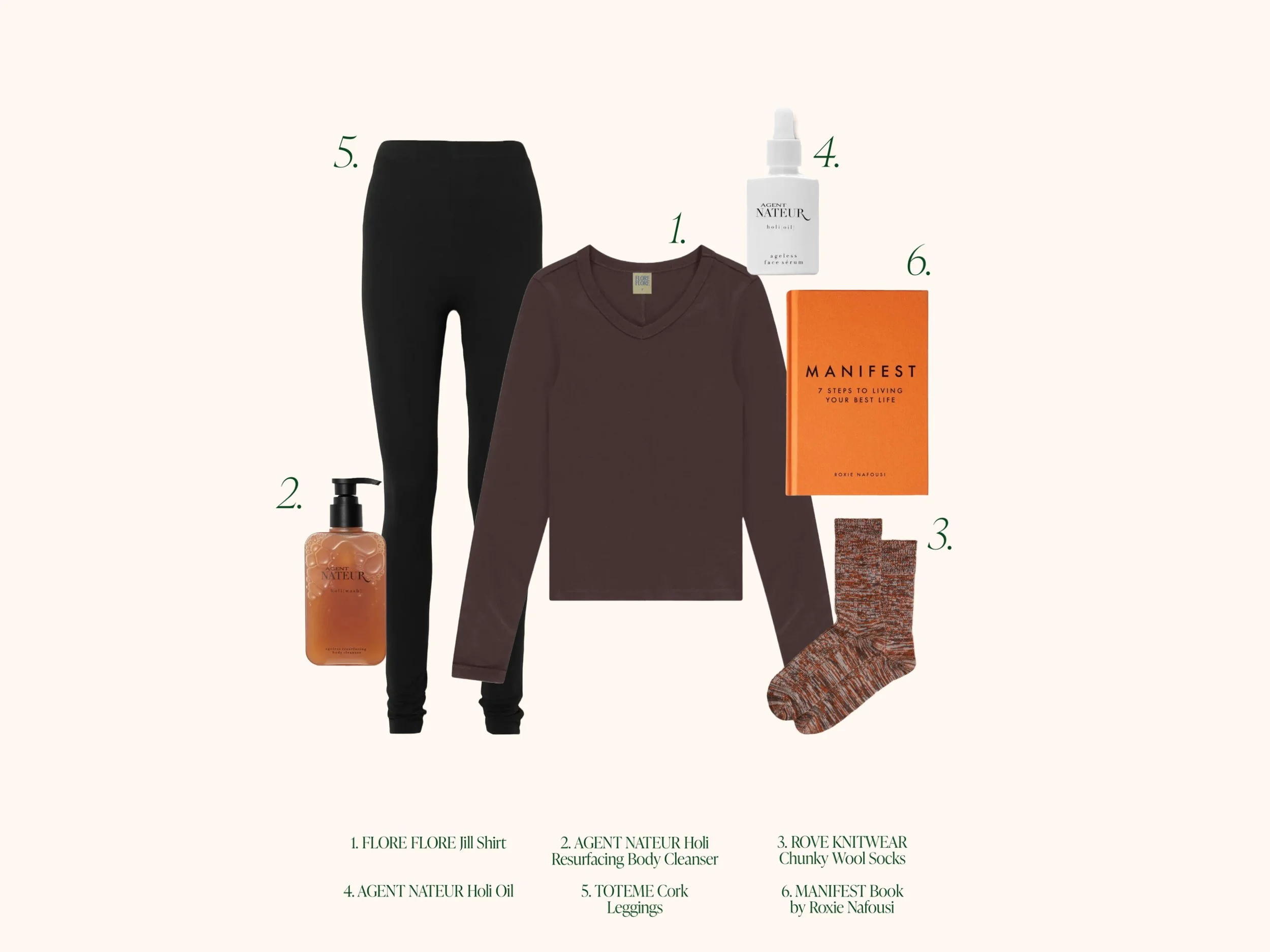We feel that Sunday night should be reserved for some much-needed me time. Why not read Roxie Nafousi’s Manifest book? She dives into 7 steps to living your best life, a perfect read before a new week ahead. No me time is complete without a bit of body & skincare treatment. We love Agent Nateur’s products for their efficiency and clean ingredients. The Holi Oil is an OG for many celebs, and the Holi Resurfacing Body Cleanser is just amazing. The outfit has to be comfy, so we picked Flore Flore’s Jill longsleeve shirt in colour choco plum which is just beautiful and Toteme’s Cork stretch-jersey leggings finish off the look perfectly. The feet will stay nice and cozy in these British made chunky wool socks from Rove Knitwear.