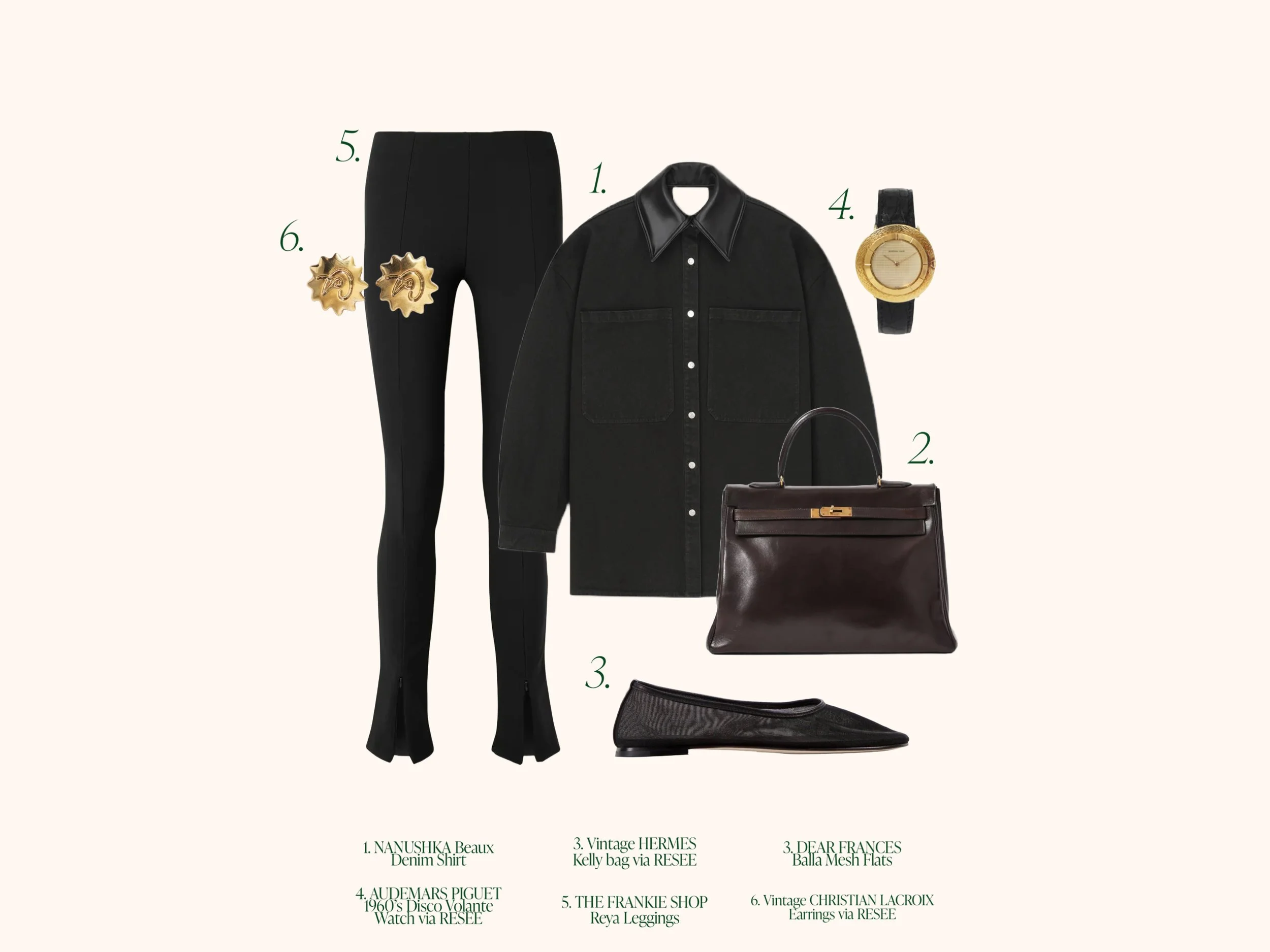 A boozy Sunday brunch with the girlfriends is sometimes very needed. This outfit has some great vintage accessories and very cool clothing, like the Nanushka Beaux leather trimmed denim shirt in black. It’s cut in an oversized fit to give it that borrowed from the boys’ look and paired with The Frankie Shop Reya ribbed stretch-jersey flared leggings it balances it out. To add warmth to the outfit, all the accessories have gold hardware, like the utterly stunning chocolate box vintage Hermes Kelly from the 70s. We’ve paired this look with a rare Audemars Piguet Gold Disco Volante Watch from the 60s and Vintage Christian Lacroix Sun Clip-on Earrings. Can you tell that our favourite flats are the Dear Frances Balla Mesh ballerinas? They are the perfect fit to this outfit.