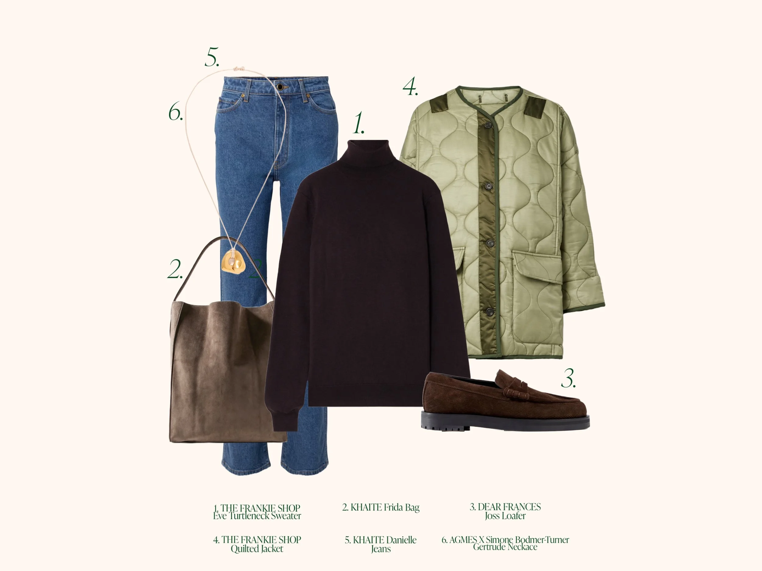 A cozy and warm outfit perfect for a sunny fall day walking around a park enjoying the sunshine and fallen leaves. The Frankie Shop Eve Merino Wool turtleneck sweater in this dark rich purple hue is such a classic piece and obviously had to pair it with The Frankie Shop Quilted padded ripstop jacket. True blue is the ideal jean colour to go with this colour palette, so the KHAITE Danielle Stretch Jean in Montgomery was the perfect pick. There is added warmth that the KHAITE Frida bag and Dear Frances Joss Loafer brings to this look. Bringing it all together is this AGMES + Simone Bodmer-Turner Gertrude recycled gold vermeil and cord necklace. Designed in collaboration with sculptor, this necklace is inspired by modern architecture and art.
