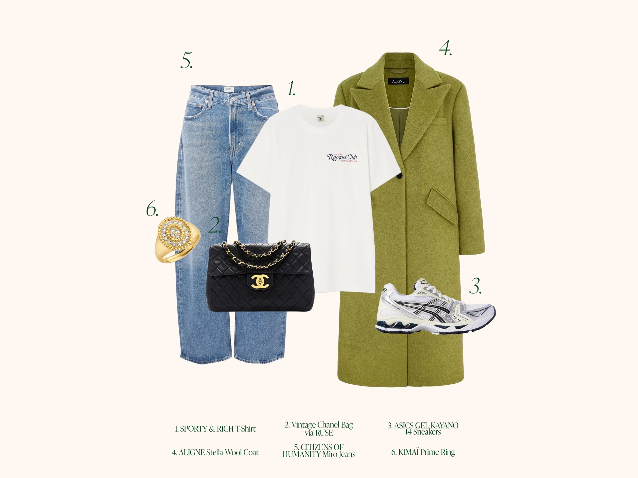 Our lunch outfit pick has to involve comfortable clothing because let’s be honest any meals with children involve a lot of running around! You have to love a good white T-shirt, and Sporty & Rich never disappoints in terms of quality & style! The same can be said for Citizens of Humanity jeans, the Miro distressed high-rise barrel-leg recycled jeans are on trend and great everyday jeans! The most comfortable pair of trainers you will ever own are the Asics Gel-Kayano sneakers. We’ve added a beautiful statement coat to make this quite relaxed look a bit dressier, the Aligne Stella wool coat, which has been seen on Katie Holmes recently. One of our favourite Kimaï pieces is the Prime ring, which is their version of a signet ring and finishing off this look? Why a large vintage Chanel flap bag of course!