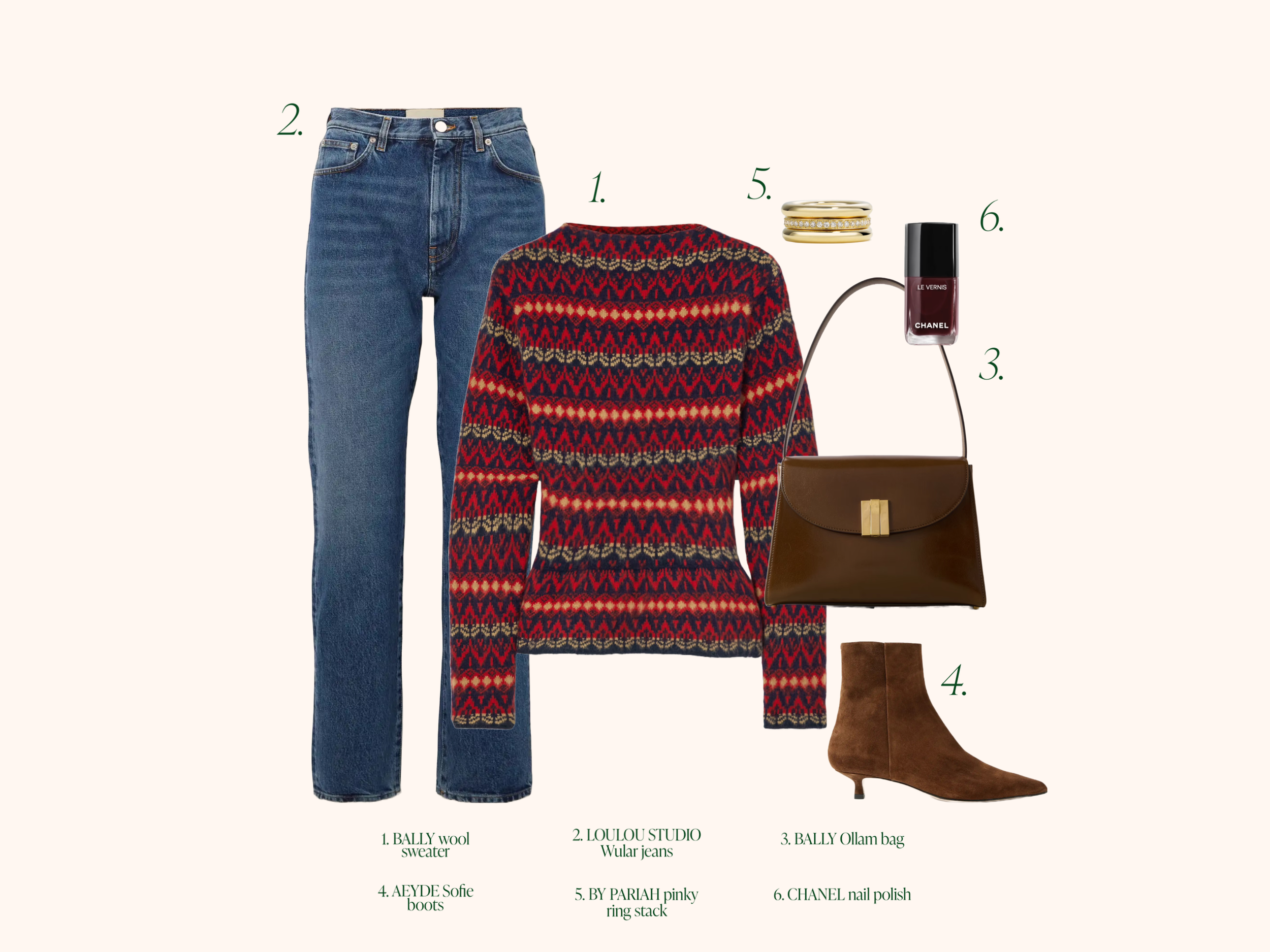 If you have a brunch (or drinks) date with friends, this is what we would wear. Bally has some great pieces this season, especially this wool sweater that is a bit fitted around the waist in a cool slightly retro pattern and the Ollam bag, very quiet luxury vibes. These Loulou Studio jeans are the perfect classic jeans and pair well with the Aeyde Sofie boots. Finishing off the outfit is this stunning ring set by one of our favourite jewellery brands, By Pariah, a stack of three pinky rings. Can’t go wrong with a dark red nail polish from Chanel