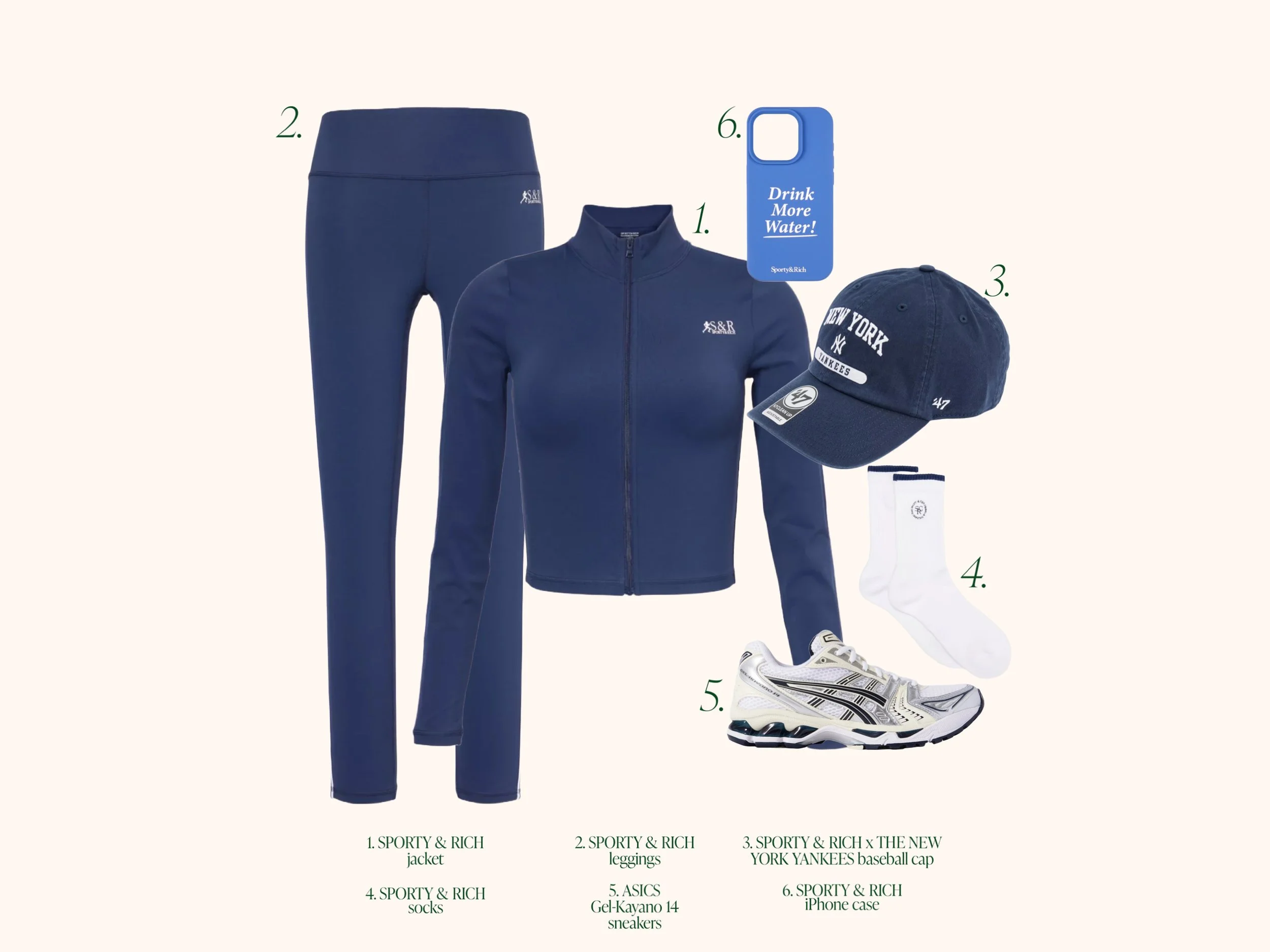 If we had planned a workout class this weekend, this is what we would wear. The Sporty & Rich zip-up jacket and leggings are the perfect navy shade. The brand also recently collaborated with the New York Yankees, and who doesn’t love the classic NY Yankees baseball cap? Our absolute favourite trainers are the Asics Gel, which are ridiculously comfy. To finish the outfit, we picked a new iPhone case from S&R and a pair of their socks too. Happy gym class!